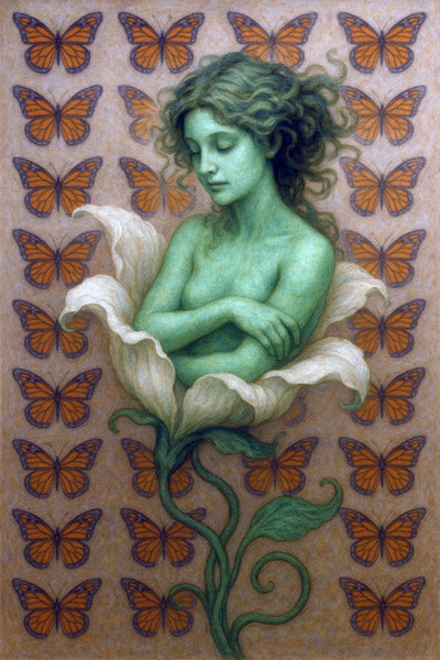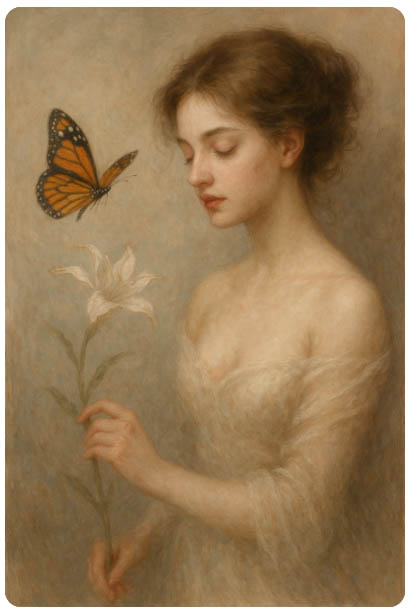 | Бабочка - мимолетность памяти Молодая девушка - страсть Цветок - мимолетность момента