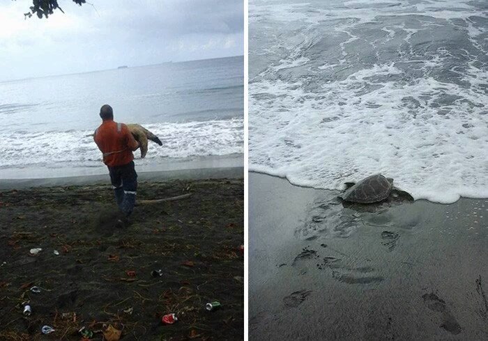 | Мужчина покупает черепах на продовольственном рынке и отпускает их обратно в море.