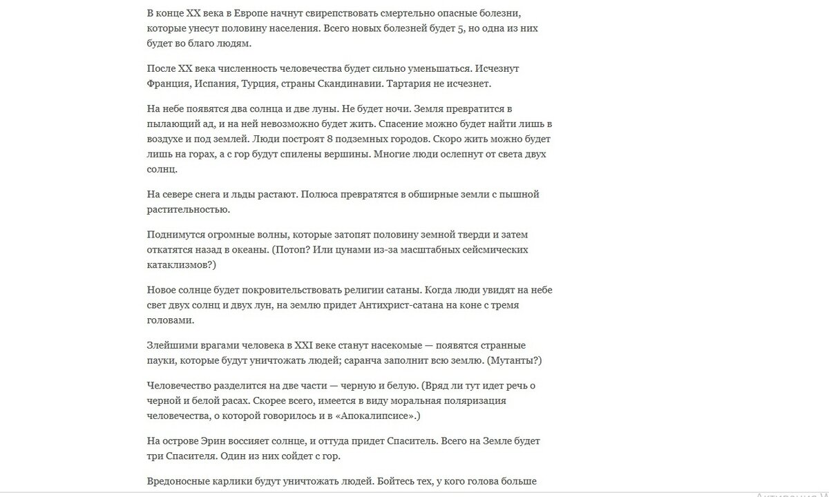 Эти смутные времена должны длится полвека, пока не завершится история "человека плотского" и не начнется новая, "человека духовного". Это будет начало новой эпохи, которая продлится 2500 лет, люди будут жить в гармонии с природой, после этого люди опять погрязнут в грехах.«Человечеству суждено пережить три потопа: первый — водяной, второй — огненный, третий — звездный».После 3 потопа небо навсегда погаснет, а человечество исчезнет.А вот как описаны предсказания монаха в книге Анны Марианис " 9 признаков Апокалипсиса осуществились. Что нас ждет дальше? Ванга, Э.Кейси и другие пророки о событиях скорого будущего". Какое из них заслуживает доверия, сказать трудно. Для этого нужно изучать оригинал, но в интернете есть ссылки только на различные книги про пророчества."В конце XX века над Востоком видно страшное облако""В конце XX века в Европе начнут свирепствовать смертельно опасные болезни, которые унесут половину населения. Всего новых болезней будет 5, но одна из них будет во благо людям".На небе появятся два солнца и две луны. Не будет ночи. Земля превратится в пылающий ад, и на ней невозможно будет жить. Спасение можно будет найти лишь в воздухе и под землей. Люди построят 8 подземных городов. Скоро жить можно будет лишь на горах, а с гор будут спилены вершины. Многие люди ослепнут от света двух солнц.
