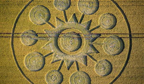 Изображение шумерской Солнечной системы в новом круге на полях 2025 года Новый круг на полях был обнаружен в Falkner's Circle, близ Эйвбери, Уилтшир, 08.06.2025 Прекрасное 10-лучевое Солнце, поразительно напоминающее древнее шумерское изображение Солнечной системы, где вокруг центрального светила расположено 11 объектов.