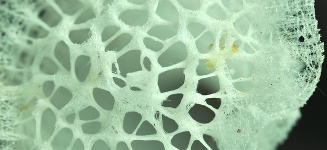 2) Гибкий скелет этой губки в руках Сяохун Ван, соавтора исследования (фото – Вернер Э.Г. Мюллер, Медицинский центр университета Майнца); 3) Микроструктура губки Monorhaphis chuni.