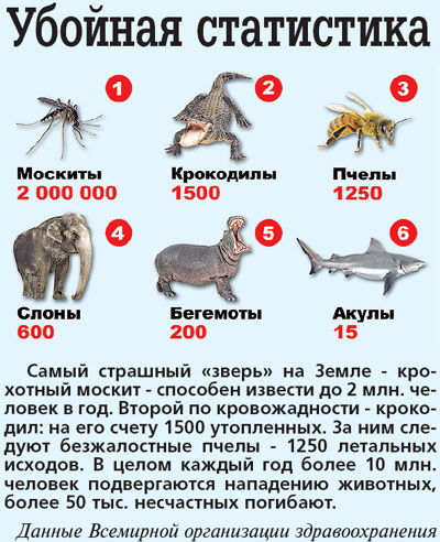 Да что акулы-медузы - в мирных городах можно подвергнуться нападению злобных тварей. Жители Одессы по утрам боятся выходить на улицу - вороны бросаются на них прямо с неба. Аналогичные случаи зафиксированы в Йошкар-Оле, Владимире, Москве. Сначала птицы нападали на людей в парках - видимо, защищали свои гнезда. Потом стали устраивать атаки прямо в городских дворах. Подростки отбили у летающих монстров пожилую женщину - те исклевали ей лицо в кровь. Другой жертве нападения понадобилась «скорая»: 50-летнему мужчине птицы разбили голову.