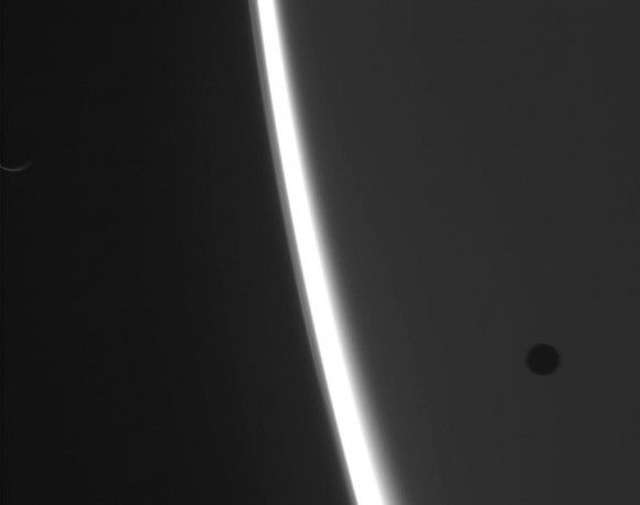 В момент, когда был сделан снимок, Cassini находился на расстоянии 1,357,903 км от Сатурна. И, если предположить, что луна большего размера слева – Энцелад, можно при желании различить более светлую область чуть выше нее, - возможно, это ледяные выбросы южных гейзеров Энцелада.