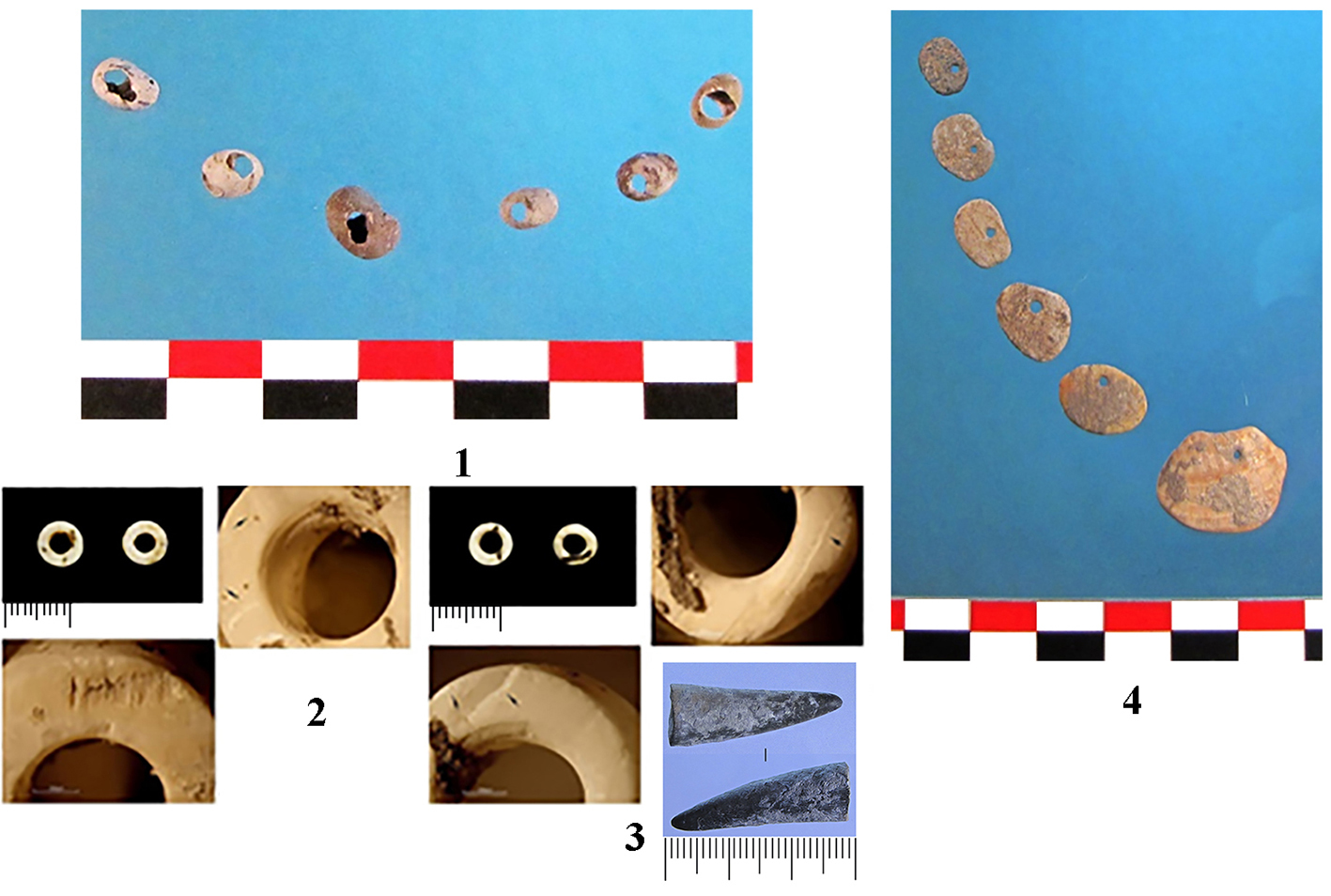 Украшения, найденные на неолитической стоянке Навес у Алебастрового завода: 1 — нашивки-бусины из раковин наземных моллюсков; 2 — бусины из белемнитов; 3 — обломок белемнита, найденный на стоянке; 4 — бусины из раковин морских моллюсков. © Любовь Голованова