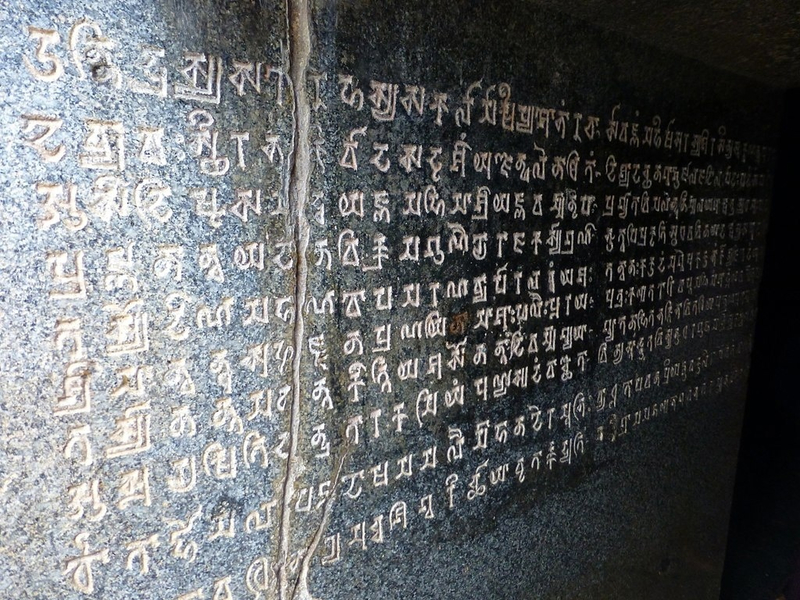 Санскритская надпись 5-6 века н.э. на стене у входа в пещеру Гопика, которая была высечена в граните в 230 году до нашей эры. Пещера является частью пещер Барабара, отмеченных своей "маурийской полировкой", которая придает каменному материалу очень гладкую и зеркальную поверхность.