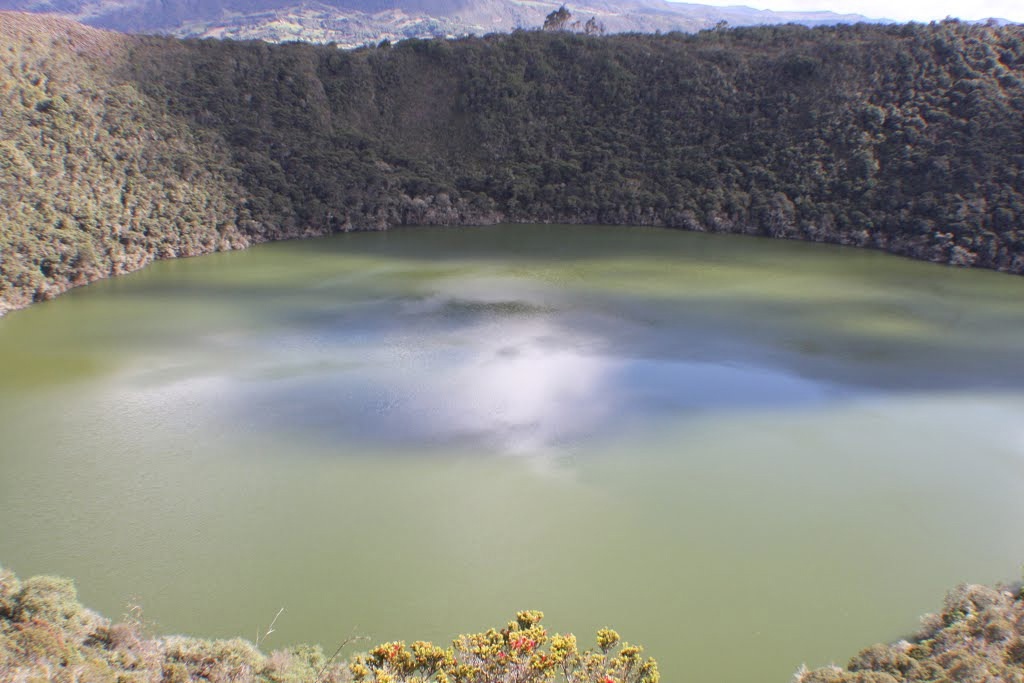 "Озеро Гуатавита находится в Колумбии, в 50 км от Боготы, в горной местности. Его форма почти круглая, оно расположено в кратере потухшего вулкана на высоте 3100 метров. Диаметр водоема порядка 1,6 километра, окружность – около 5 километров. С 1965 года оно является национальным достоянием страны.