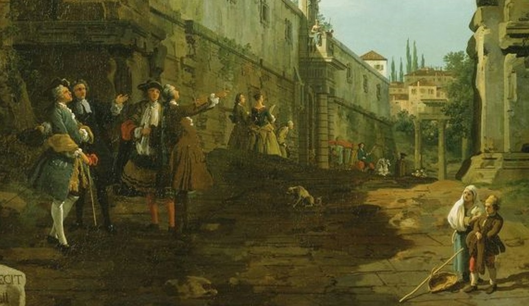 На этой картине изображена Арка Тита, стоящая в юго-восточном конце Форума у начала Священного пути. Это самая старая из великих римских триумфальных арок, она была возведена в 81 году нашей эры в честь взятия Иерусалима императором Титом. Им любуется группа из трех джентльменов - "больших туристов" со своим абате или цицероном (гидом). Через арку слева видна стена садов Фарнезе XVI века, а вдали - руины храма Кастора и Поллукса.