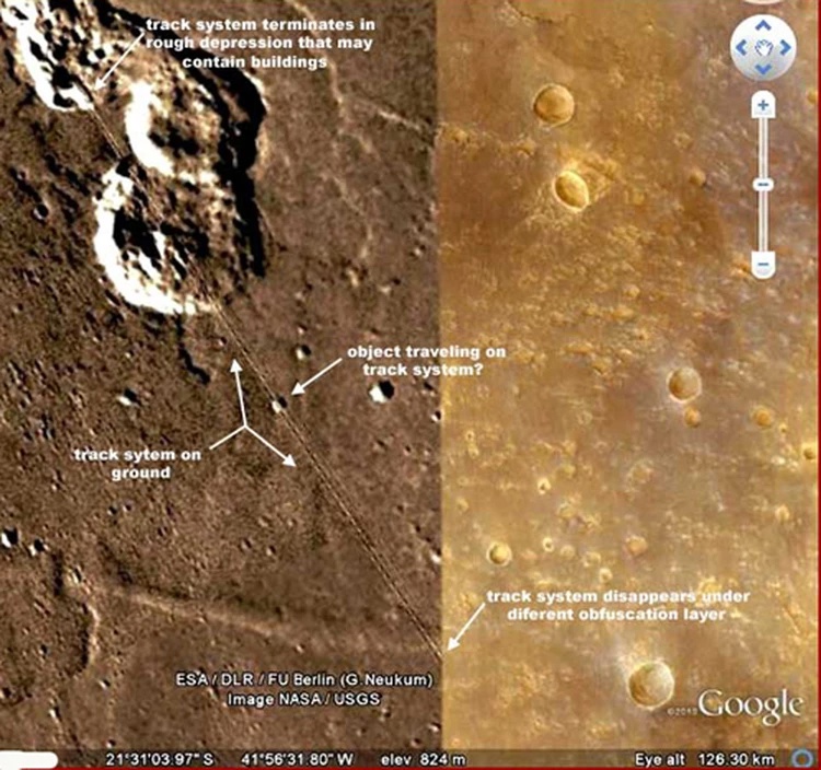 На снимках Google Mars (фото для которого поставляли разные аппараты, находившиеся на орбите Марса). обнаружены «железная дорога» и «вокзал». Транспортная система, похожа на железнодорожную или на монорельсовую. Или на какую-то иную, поскольку ее "рельсы" выглядят прерывистыми.
