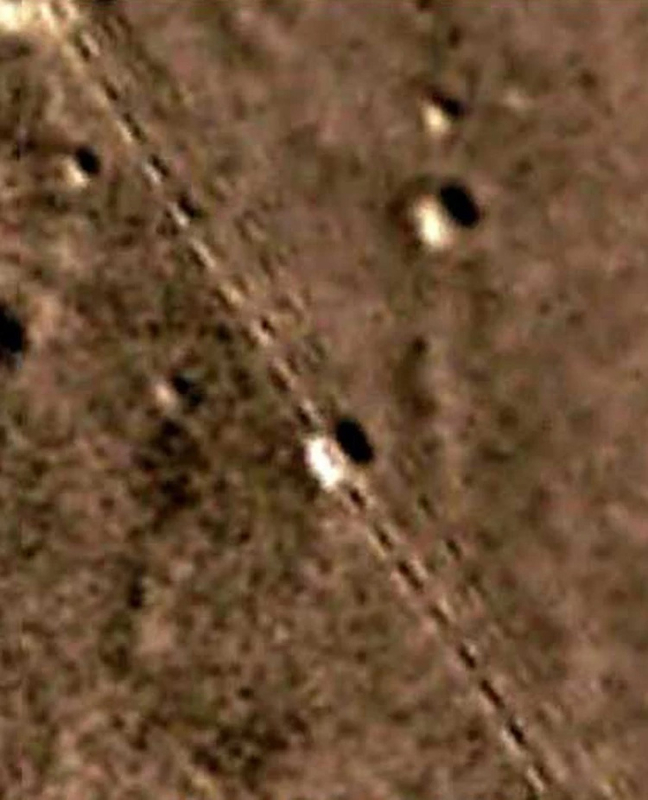 Самое удивительное, что видна не только дорога, но и средство передвижения по ней. Не очень далеко от "вокзала" заметен прямоугольный объект, расположенный прямо на "путях". Версия с вагоном - скорее всего, монорельсовым - выглядит логичной. Ведь объект отбрасывает тень так будто бы расположен в нескольких метрах от поверхности.