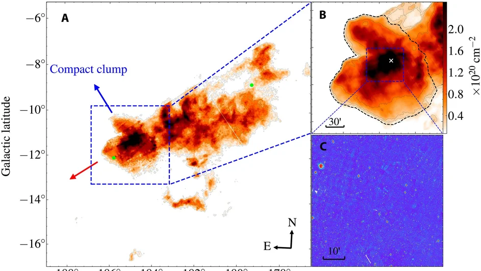 Облако расположено примерно в 900 тысячах световых лет от нас. Это в несколько раз дальше знаменитых Магеллановых Облаков, но на этом расстоянии наблюдают другие маленькие галактик. Впрочем, откуда именно происходит это летящее к нам вещество, пока неясно, но дело не в этом.