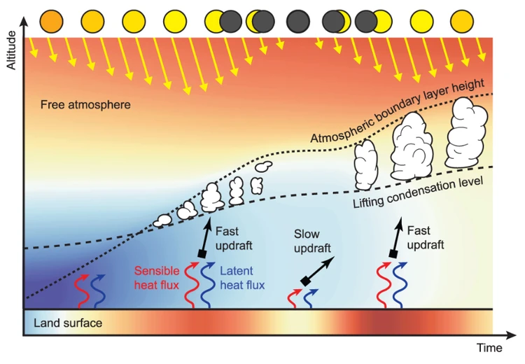 Разобраться в сути феномена помогло моделирование. Вот, что оно продемонстрировало: Солнце скрывается – поверхность Земли охлаждается, в результате уменьшаются восходящие потоки теплого воздуха. Они несут водяной пар, который конденсируется в капли, поднимаясь на более прохладные высоты – туда, где образуются кучевые облака.
