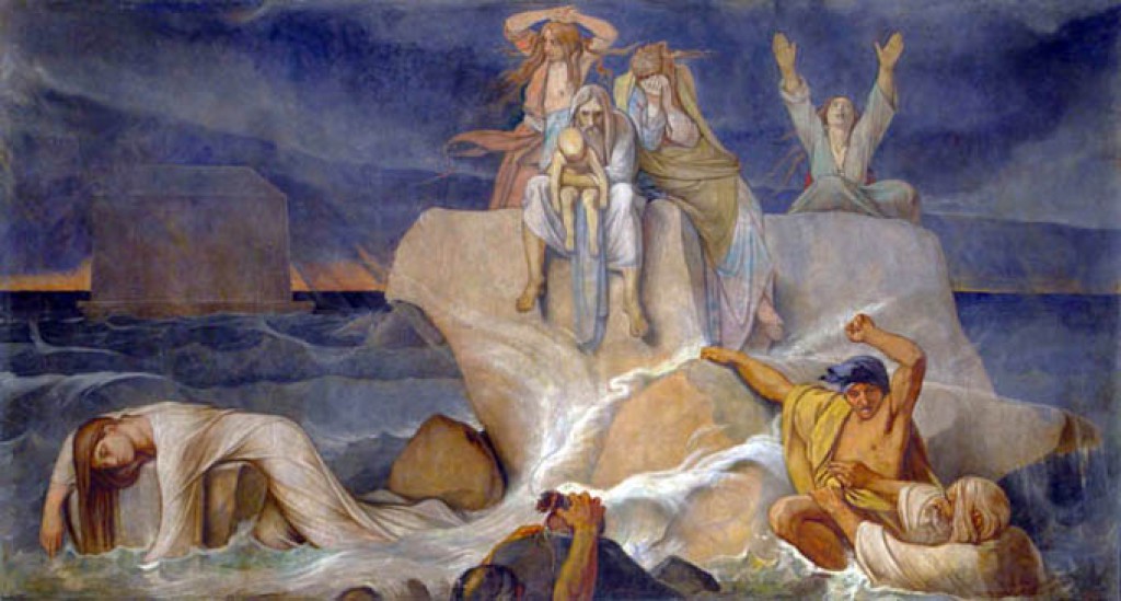 Люди, звери, растения — все скрылось под водой. В живых остались лишь двое праведников: Девкалион, сын Прометея, и его жена Пирра. По совету Прометея они построили корабль и спаслись на нем.