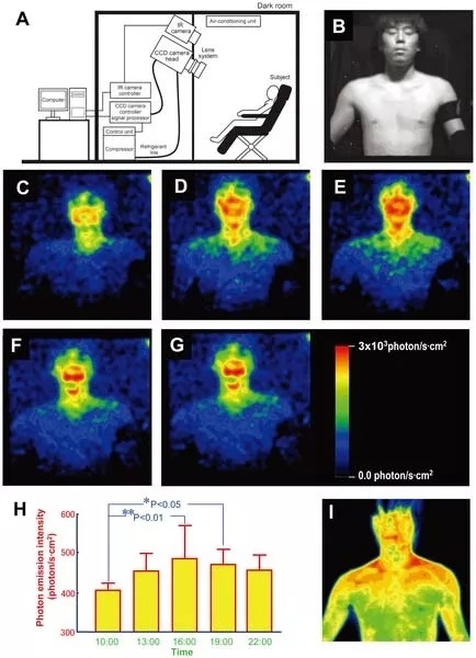 Чтобы узнать больше об этом слабом видимом свете, ученые из Японии использовали сверхчувствительные камеры, способные регистрировать отдельные фотоны. Пять здоровых мужчин-добровольцев в возрасте 20 лет были помещены с обнаженной грудью перед камерами в полной темноте в непроницаемых для света комнатах на 20 минут каждые три часа с 10 утра до 10 вечера в течение трех дней.