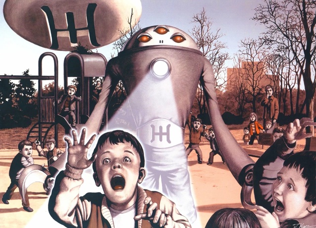 Трехглазый пришелец (ростом 3 метра) в серебристом комбинезоне, бронзовых ботинках и с диском на груди исчез, затем снова приземлился и вышел на прогулку с напарником и роботом.