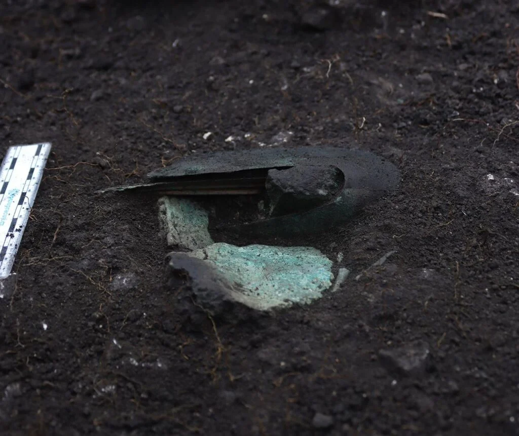 Археологи из Городского музея Брно совершили редкую и ценную находку в Южной Моравии — фрагмент бронзового доспеха возрастом 3200 лет, относящийся к позднему бронзовому веку. Артефакты, обнаруженные в 2023 году на закрытом для публики участке, включают не только часть нагрудника воина, но также наконечник копья, серп, бронзовую булавку и фрагменты меди — все эти предметы были захоронены вместе, что, по мнению исследователей, указывает на ритуальное подношение.