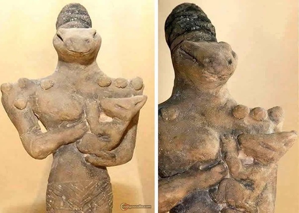 Среди самых странных статуэток — женские фигуры, кормящие младенцев с такими же рептилоидными чертами.
