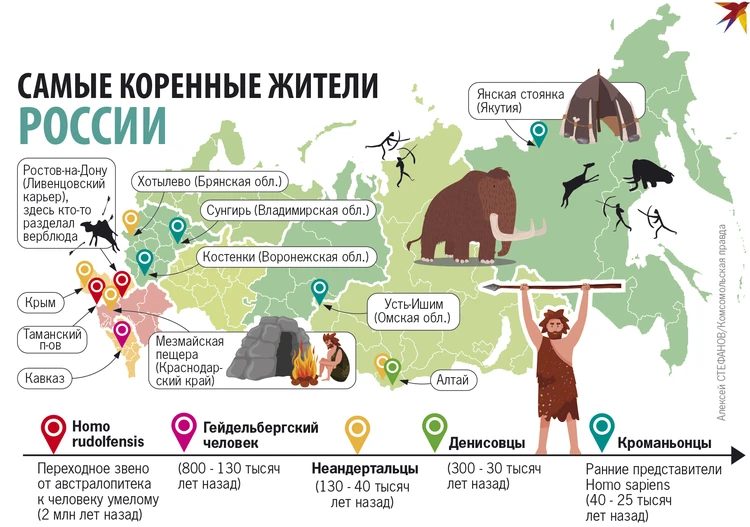 Далее - неандертальцы (жили 130 - 40 тысяч лет назад) и денисовцы (300 - 30 тысяч лет назад), они изучены лучше, потому что находок больше. Денисовцев у нас находили на Алтае, а орудия труда неандертальцев - в Хотылеве, скелеты и отдельные «запчасти» типа зубов - в Крыму, на Кавказе, на Алтае. В Мезмайской пещере (Краснодарский край) в 1993 году обнаружили скелеты двух детей-неандертальцев.