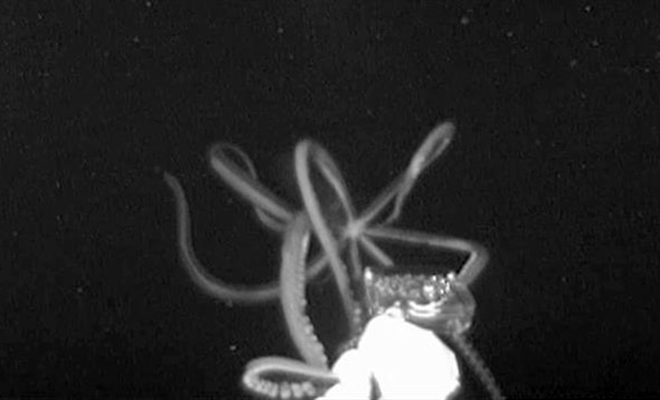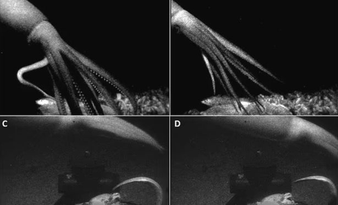 Ученые впервые сняли на видео охоту гигантских кальмаров на глубине