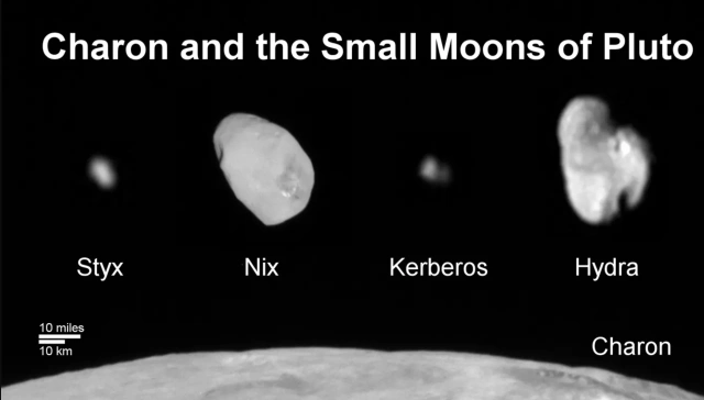- Стикс. Открыт в 2012 году. Назван в честь реки в царстве мертвых. Диаметр — 10 км. Расстояние до Плутона — 42 656 км.