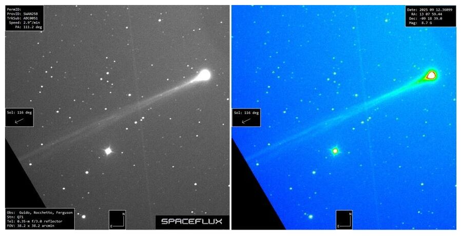 12 сентября 2025 года любители и профессионалы, следящие за ночным небом, получили неожиданный подарок. «Комета достигла блеска 7,5 звёздной величины, этого достаточно, чтобы разглядеть её в любительский телескоп», — сообщает Эрнесто Гвидо, один из первых, кто зафиксировал её появление. Этот снимок был сделан всего через несколько часов после обнаружения с помощью сети телескопов «Спейсфлюкс».