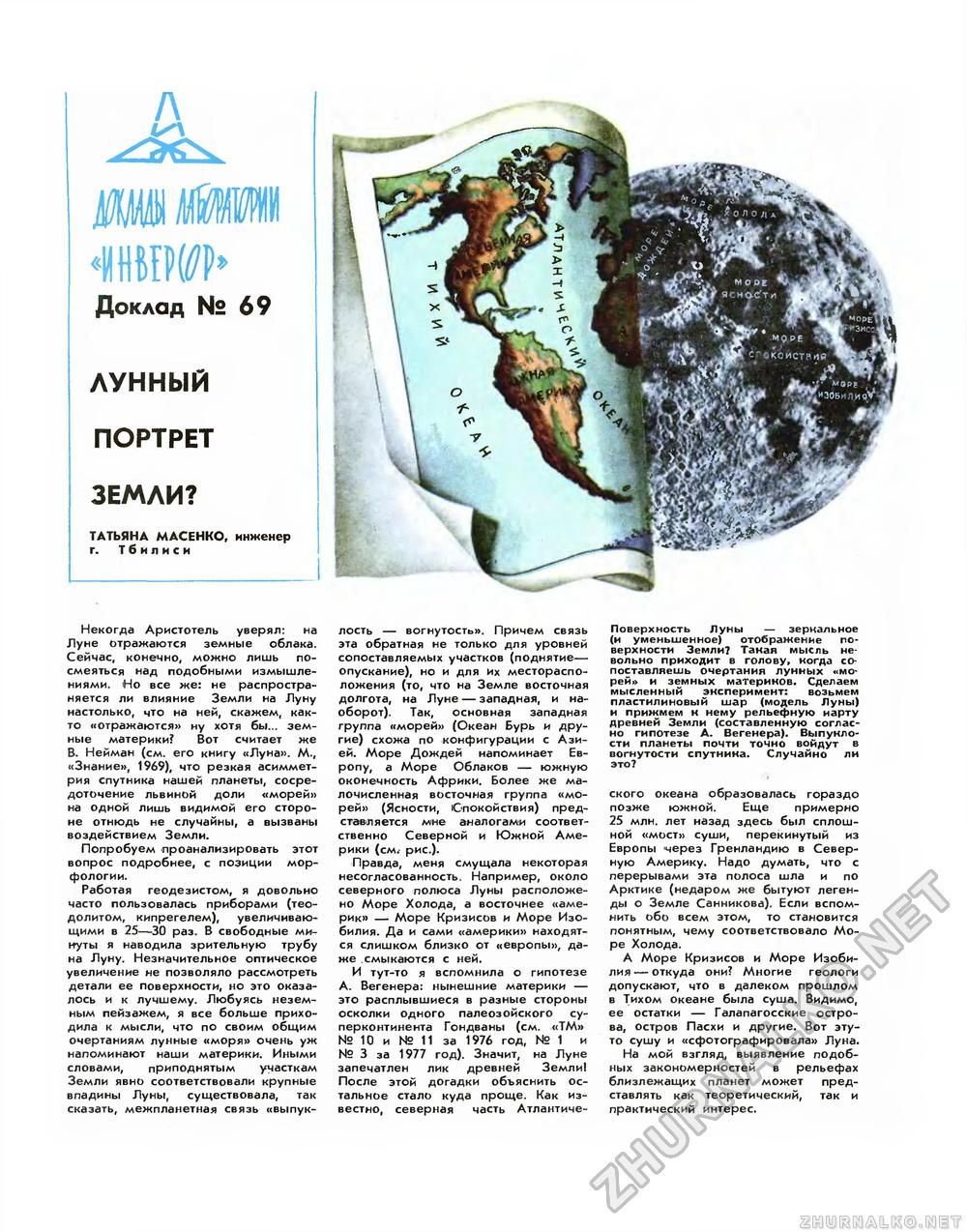 Всё началось с простого, но гениального наблюдения. Инженер-геодезист из Тбилиси Татьяна Масенко, работая с теодолитом, в свободные минуты рассматривала Луну. Небольшое увеличение прибора не позволяло разглядеть детали, зато открывало общую картину. И эта картина оказалась поразительной: очертания тёмных лунных «морей» до странности напоминали контуры земных материков.