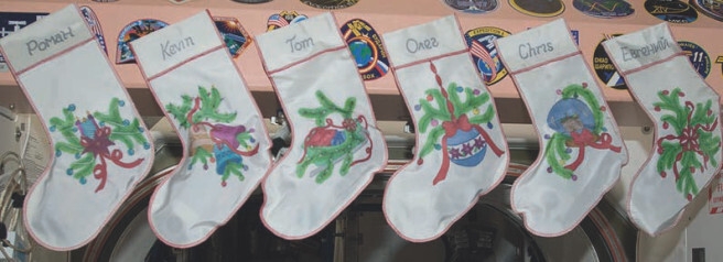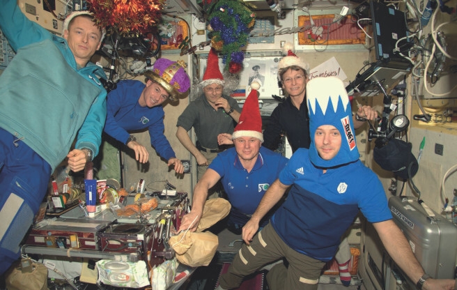Главный же атрибут орбитального досуга — это, конечно, головные уборы. Шапки Санта-Клауса, парики из белых волос, бейсболки, шапка в виде британской короны или даже пирожного с отверстием для лица. Всё это надевается без всякого повода, создавая впечатление, что экипаж постоянно готовится не к выходу в открытый космос, а к выступлению в цирке-шапито.