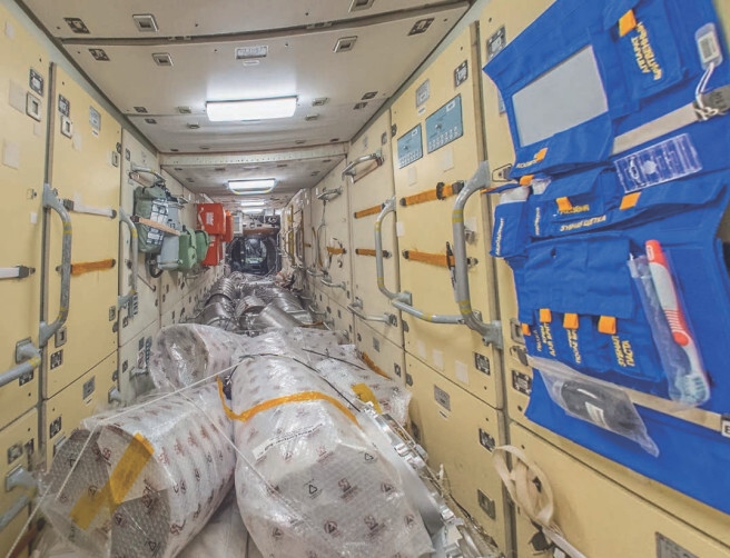 Российский сегмент станции — это настоящий заповедник ностальгии по позднему СССР. Доминирующий грязно-жёлтый цвет стен — тот самый, что по канонам советской психиатрии считался «успокаивающим для больных». Видимо, расчёт был на то, что длительное пребывание в тесной металлической коробке в состоянии невесомости требует подобной терапии. Повсюду массивные поручни, грубо окрашенные серой матовой краской, словно позаимствованные с завода тяжёлого машиностроения.