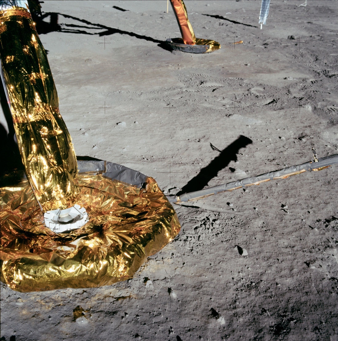Однако на всех фотографиях и видеозаписях мы видим нечто иное. Грунт под «Орлом» выглядит абсолютно нетронутым, с явными следами ботинок астронавтов, которые подошли к модулю вплотную. На опорах и самой ступени нет ни малейших следов осевшей пыли. Создаётся впечатление, что аппарат не садился, а был аккуратно установлен подъёмным краном в готовую «лунную» декорацию.