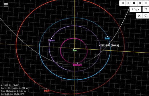 Согласно данным системы JPL Horizons, которая является своего рода навигатором по Солнечной системе, комета SWAN совершит максимальное сближение с Землёй в период с 18 по 21 октября 2025 года. В это время расстояние между ней и нашей планетой составит всего 0,26 астрономических единицы — это примерно 39 миллионов километров. По космическим меркам — почти рукопожатие.