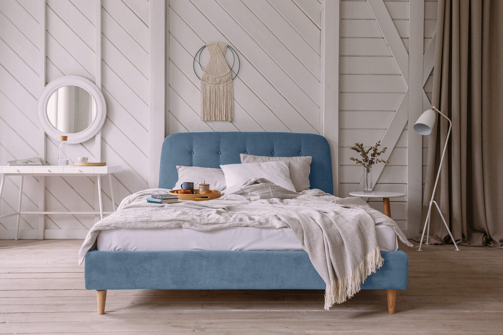 Светлая сосна + тёмная ткань → контрастное решение для скандинавского стиля.