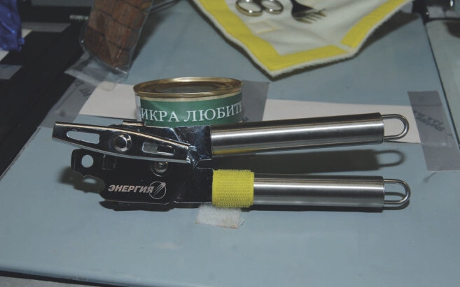 Есть в этой укладке и механический консервный нож для открывания консервных банок, многие из которых до сих пор не имеют ключа для быстрого вскрытия. Всё по старинке – нужна открывашка. Открывашка на МКС! А ничего, что при процессе открывания консервной банки ножом или этой открывашкой в условиях невесомости по всей станции будет летать микро-жестяная пыль? Когда вскрываешь банку, то образуются микро кусочки железа из которого она сделана.