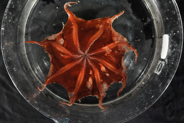 Кусочек желе кроваво-красного цвета диаметром всего 4 см - хищник, хватающий добычу своими щупальцами. Ученые, обнаружившие его в морском национальном парке Карнарвон, дали новому виду название Карнарвонский осьминог-оладушек. На дне он плоский, как блин, а плавает, приняв форму зонтика.