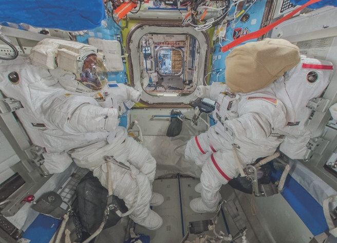 Всего на станции четыре скафандра для выхода в открытый космос. Два из них в российском сегменте (скафандры «Орлан-МКС») и два – в американском (скафандры EMU 3003). Находятся эти скафандры там годами. Срок эксплуатации российских скафандров – 5 лет. Рассчитаны они на 20 выходов в открытый космос. Космонавты и астронавты работают в этих скафандрах за пределами станции по 6–8 часов. Снаружи эти скафандры облучает солнечная радиация и космическое реликтовое излучение, а космонавты собирают на скафандры пыль с содержанием урана и тория.