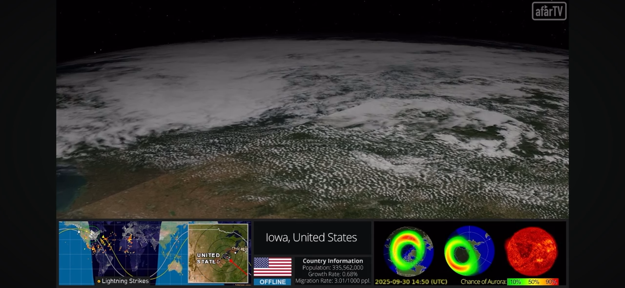 На этом видео "прямая трансляция с камер установленных на МКС" которая велась 30 сентября 2025 года. МКС в этот момент пролетала над северной частью США.