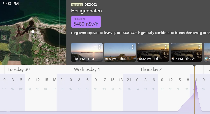 Значительные выбросы радиации (5480 нЗв/ч) от севера Германии до Мюнхена во время наблюдений дронов. Можно практически проследить траекторию дронов, отслеживая уровень радиации.