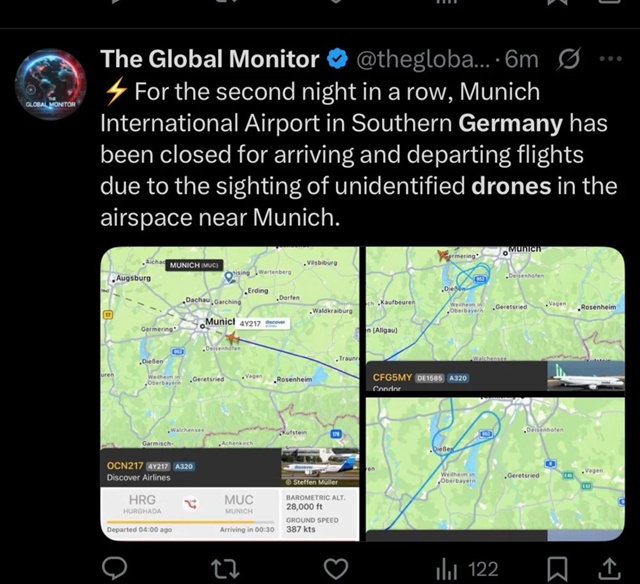 По сообщениям Reuters, над аэропортом Мюнхена были замечены беспилотники, а самолеты отклоняются от маршрута.