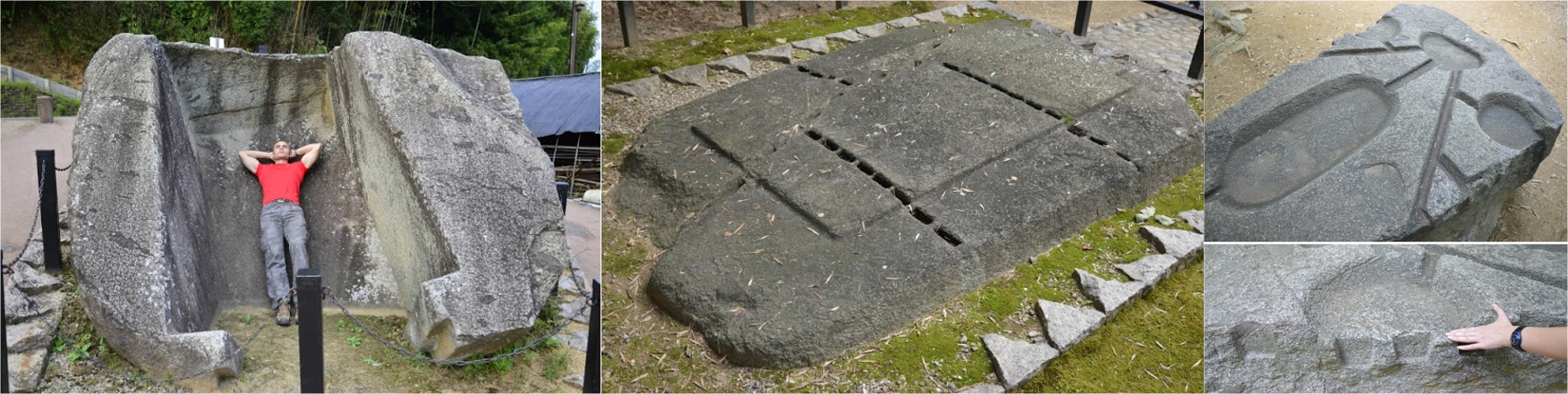 Самый любопытный из них - гранитный "скальный корабль" (Masuda no iwafune), расположенный ниже. Боковые стороны и центральный "мост" выглядят обработанными, два внешних "моста" выглядят поврежденными или незаконченными.