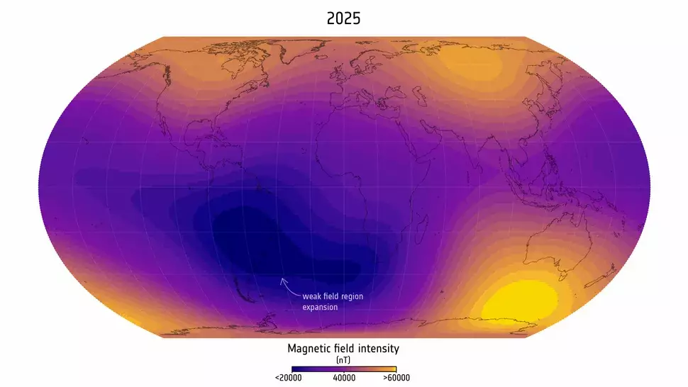В Европейском космическом агентстве (ESA) сообщили, что область ослабленного магнитного поля Земли — так называемая Южно-Атлантическая аномалия — за последние десять лет увеличилась примерно на половину площади Европы. Спутники миссии Swarm показали, что ослабление поля особенно ускорилось после 2020 года.