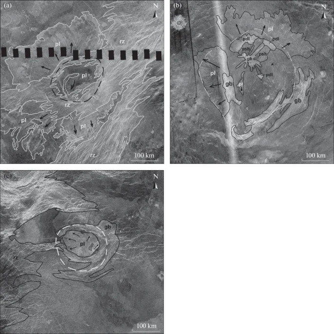 Вершины, являющиеся источниками лопастных равнин, подразделяются на три топографических класса: (а) Гора Нахас-цан (регион Атла), класс D, 14,4° северной широты, 204,9° восточной долготы, d = 167 км; (б) Эрешкигаль (Ахтамарская равнина), класс W, 21° северной широты, 84,3° южной широты. E, d = 334 км; c) Ринд (равнина Хинемоа), класс U, 8° северной широты, 247,6° восточной долготы, d = 137 км. Стратиграфические единицы включают в себя рифтовые зоны (rz), желобчатые пояса (gb), равнины с плотными трещинами (pdl) и щитовые равнины (psh). Потоки лавы на допастных равнинах (лп) из окружающих структур показаны стрелками; границы короны отмечены пунктирными линиями. Все изображения выполнены в синусоидальной проекции, на основе данных миссии "Магеллан", с пространственным разрешением ~225 м/пиксельИсточник: https://link.springer.com/