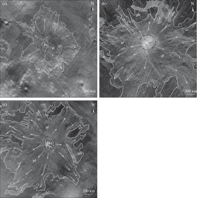 Вулканы трех размерных групп: (а) Гора Кокьянвути (регион Ульфрун), группа 1, 35,6° северной широты, 211° восточной долготы, d = 464 км; (б) Гора Идунн (регион Imdr), группа 2, 46,6° южной широты, 214,6° восточной долготы, d = 306 км; (в) Гора Сочикецаль (равнина Русалка), группа 3, 3,5° Северной широты, 270,1° Восточной долготы, d = 204 км. Стратиграфические единицы: щитовые скопления (sc), желобчатые пояса (gb) и рифтовые зоны (rz). Лавовые потоки обозначены стрелками, а основания вулканов - пунктирными линиями. Все изображения выполнены в синусоидальной проекции, основанной на данных миссии «Магеллан», с пространственным разрешением ~225 м/пиксель.Источник: https://link.springer.com/