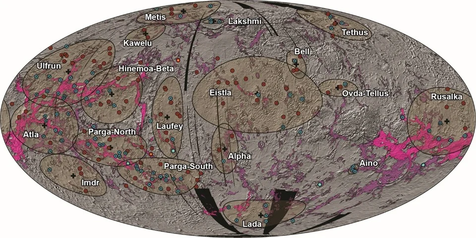 Регионы Венеры, где преимущественно концентрируются крупные вулканы и короны, являющиеся источниками лопастных равнин. Красными точками показаны вулканы, синими — короны. Фиолетовые зоны — пояса борозд, розовые зоны — рифты. Геологические границы поясов борозд и рифтов приведены из (Ivanov, Head, 2011). Основа — топография поверхности, полученная методом Hillshade. Карта в равноплощадной проекции Mollweide, центральный меридиан 180 ºИсточник: Новости РАН