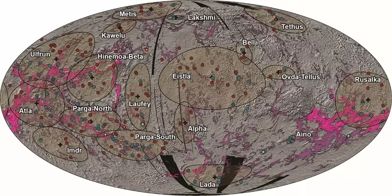 Регион Тетус включает в себя 3 вулкана и 3 короны. Вершины вулканов обозначены синими (группа размеров 2) и фиолетовыми (группа 3) треугольниками, их основания очерчены фиолетовыми и синими пунктирными линиями, а края венцов обозначены оранжевыми, зеленымиИсточник: https://link.springer.com/