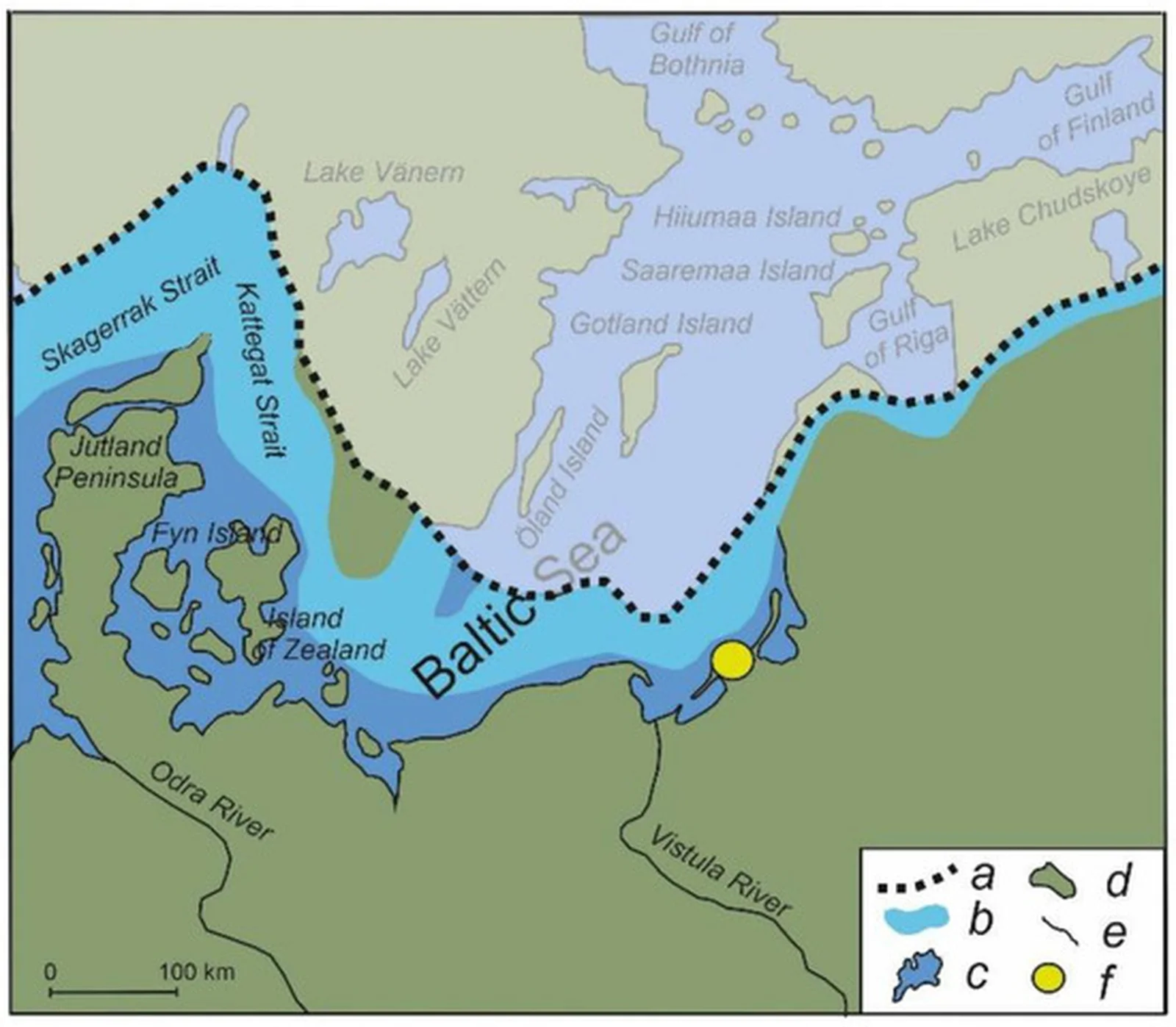 Местонахождение Куликовского осадочного архива. Условные обозначения: a — южная граница скандинавского ледника; b — Балтийское ледяное озеро около, c — современное Балтийское море, d— современная суша, е — реки, e — участок Куликово поле.Источник: https://www.mdpi.com/