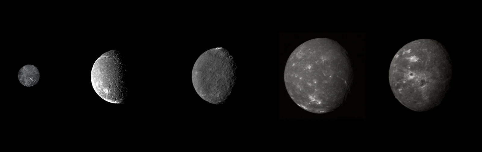 Наиболее крупные спутники Урана. Слева направо: Миранда, Ариэль, Умбриэль, Титания, ОберонИсточник: https://commons.wikimedia.org/