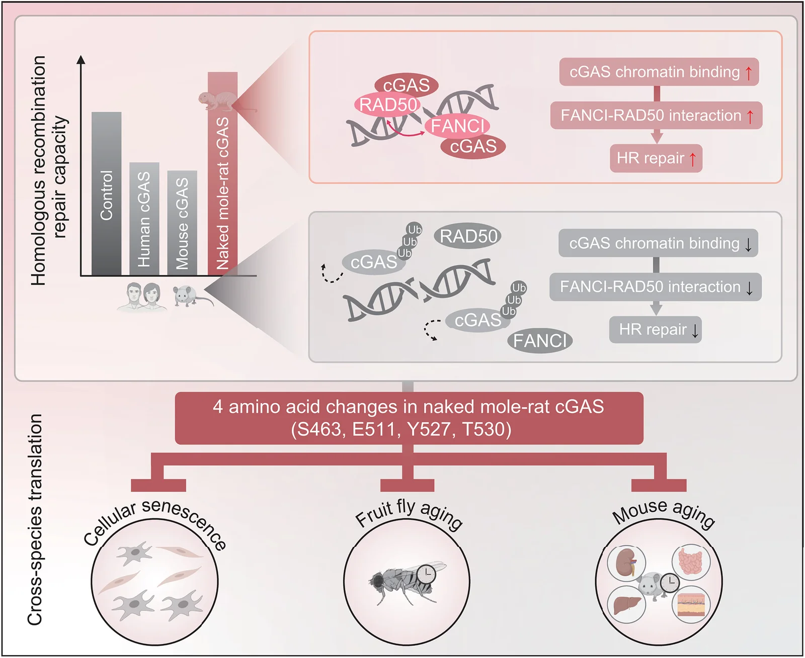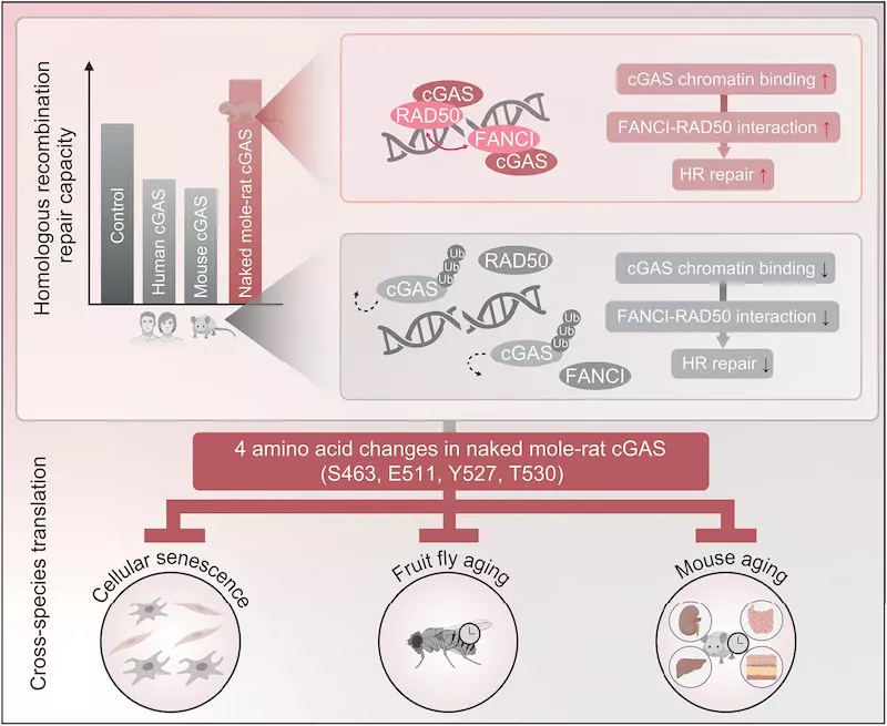 Для выяснения того, каким образом голые землекопы преодолевают данное ограничение, группа ученых под руководством Юй Чэня исследовала активность их варианта cGAS. Было обнаружено, что четыре точечные мутации в структуре cGAS увеличивают срок активности фермента и предотвращают преждевременную деградацию белков, участвующих в восстановлении ДНК. Благодаря этому повышается взаимодействие cGAS с важнейшими белками, такими как FANCI и RAD50, и ускоряется восстановительные процессы.