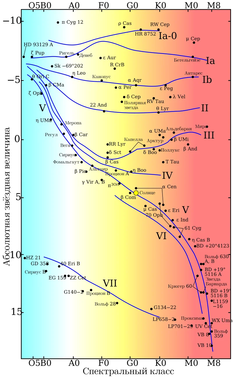 Диаграмма Герцшпрунга-Рассела. Красные карлики (звезды M-класса) — наименее горячие звезды главной тпоследовательности.Источник: https://commons.wikimedia.org/