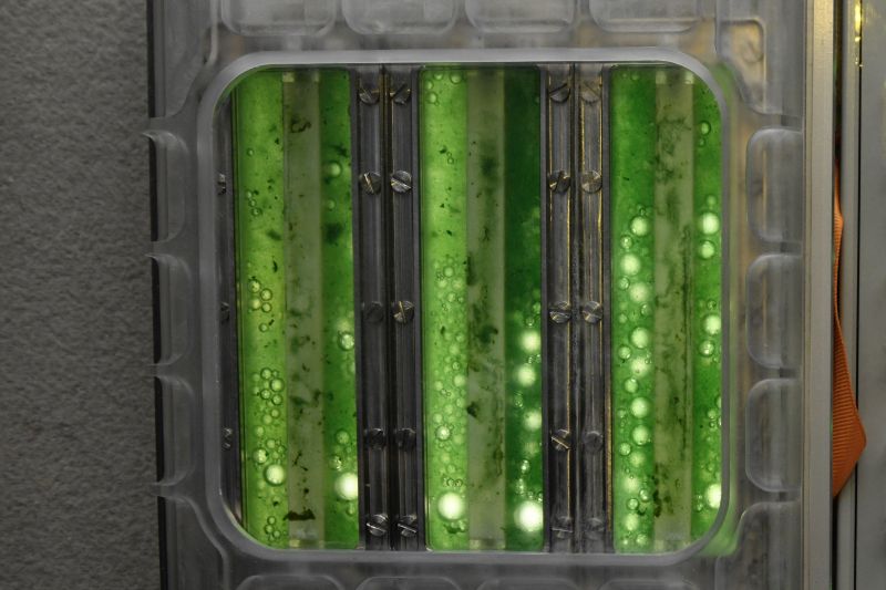 В ходе эксперимента "Фотобиореактор" в условиях невесомости выращивают микроводоросли для производства кислорода и получения дополнительного источника питания. Водоросли в процессе фотосинтеза поглощают углекислый газ и выделяют кислород. А источник пищи — спирулина — это природный суперфуд, богатый легкоусвояемым белком, витаминами и аминокислотами.