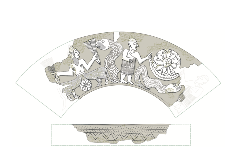 Рельефы на сосуде, хотя и повреждённые временем, удалось реконструировать. Они разделены на две сцены: