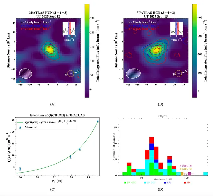 Спектроскопические наблюдения межзвёздного объекта 3I/ATLAS с помощью Атакамской большой миллиметровой/субмиллиметровой решётки (ALMA) позволили обнаружить метанол (CH3OH) и цианистый водород (HCN). Известно, что эти молекулы образуются на ледяных пылевых зёрнах в холодной межзвёздной среде и являются ключевыми предшественниками сложной органической химии, имеющей отношение к происхождению жизни.