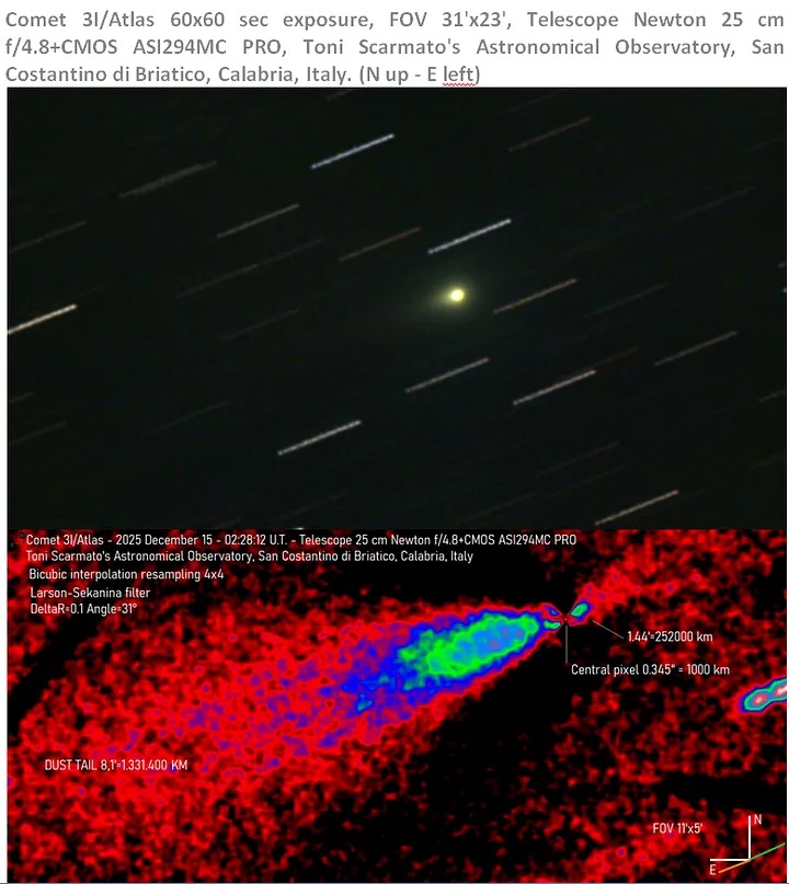 Масштаб явления беспрецедентен: антихвост простирается на полмиллиона километров от ядра ATLAS — это больше, чем расстояние от Земли до Луны (384 400 км). Ни у одной известной кометы в истории не наблюдалось анти‑хвоста таких размеров.